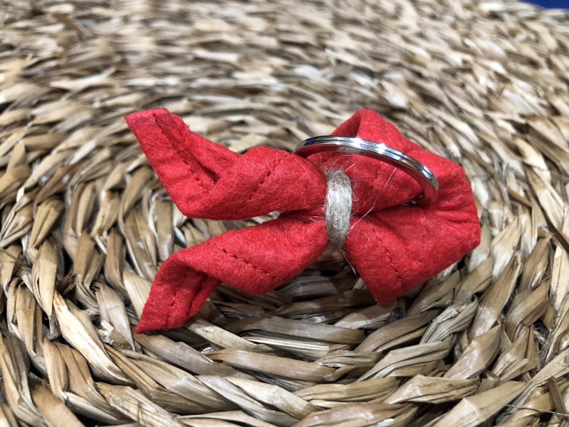• Argola metálica com laço vermelho sobre base trançada de fibras naturais