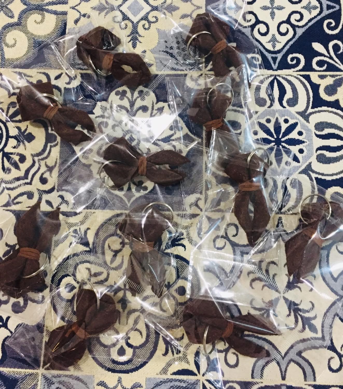 Porta-chaves de tecido castanho em embalagem plástica sobre padrão azul e bege